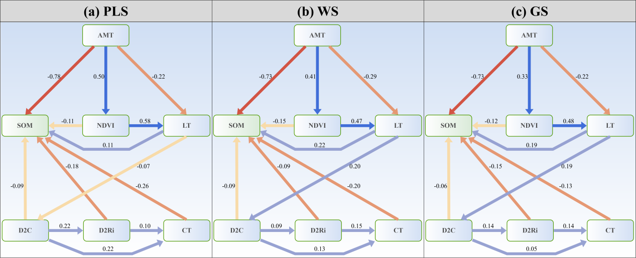 圖2. 結(jié)構(gòu)方程模型展示了不同尺度下各驅(qū)動(dòng)因素對(duì)SOM的直接影響和間接影響