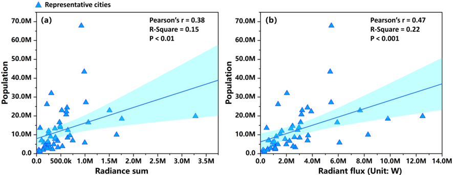 使用輻射通量代替輻亮度來描繪夜間燈光,提升了夜光遙感數據估算社會經濟參數的準確性,還解決了像元輻亮度相加沒有物理意義這一問題。夜光遙感本質是對夜光輻射能量的探測,從能量的角度來看,以瓦特為單位的輻射通量更接近人類對能量的理解,可以更加直觀地反映夜間燈光能量的強弱。