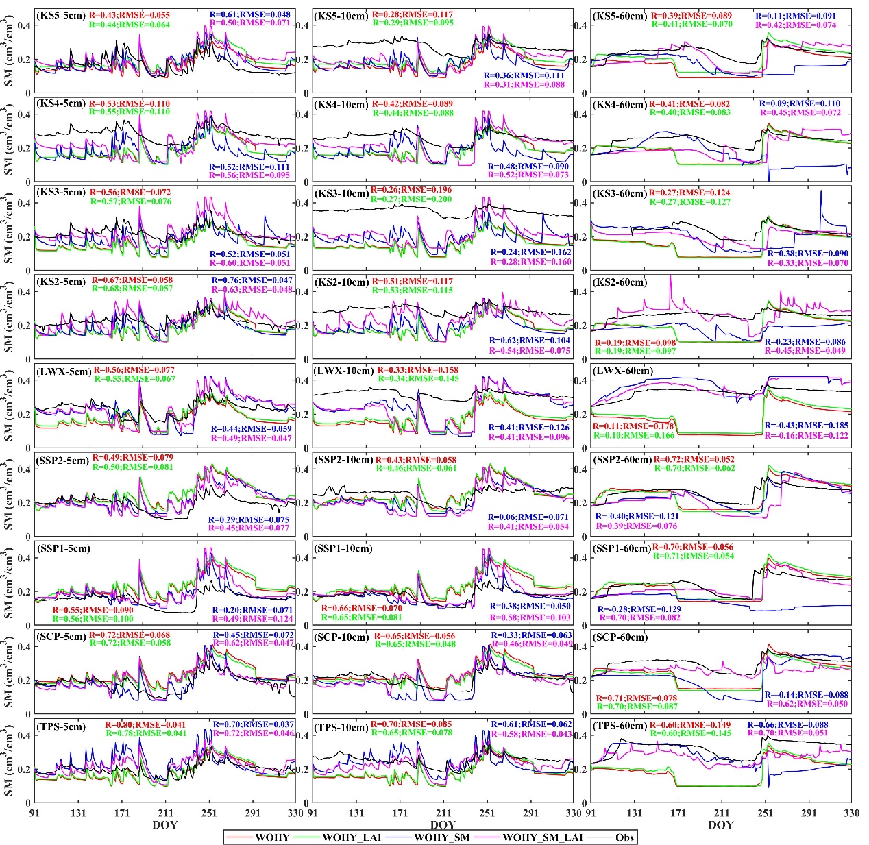圖2同化估算的根區土壤水分與站點觀測時序數據對比分析