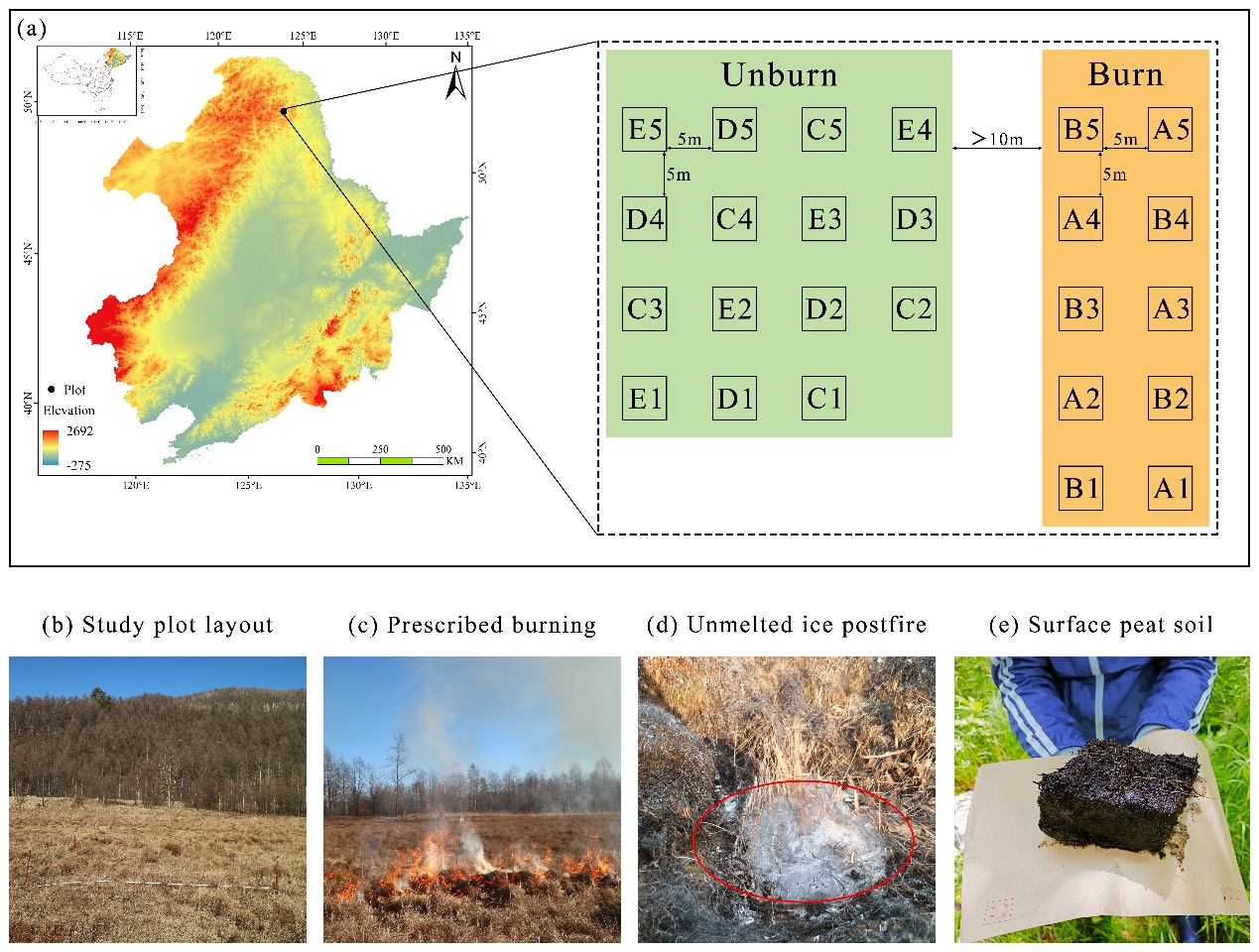 氣候變化和人類活動(dòng)正在增加泥炭地野火的頻率,嚴(yán)重威脅多年凍土區(qū)泥炭地的碳庫。大興安嶺凍土泥炭地是我國(guó)唯一的高緯度多年凍土泥炭地,位于全球高緯度多年凍土區(qū)的最南端,對(duì)氣候變化具有高度敏感性。該地區(qū)泥炭地與森林生態(tài)系統(tǒng)交錯(cuò)分布,在林火頻發(fā)的大興安嶺地區(qū)具有重要生態(tài)功能。作為林緣部位的重要生態(tài)系統(tǒng),大興安嶺泥炭地在區(qū)域林火防控中發(fā)揮著關(guān)鍵作用。目前,大興安嶺多年凍土區(qū)林緣泥炭地火管理已成為森林防火的重要手段,并由當(dāng)?shù)亓謽I(yè)部門每年秋季對(duì)區(qū)內(nèi)林緣泥炭地實(shí)施計(jì)劃火燒。雖然計(jì)劃火燒對(duì)防控森林火災(zāi)效果顯著,然而計(jì)劃火燒也通過消耗地表枯落物和產(chǎn)生熱解碳對(duì)泥炭地的碳庫產(chǎn)生影響,其影響過程和潛在機(jī)制亟待評(píng)估。