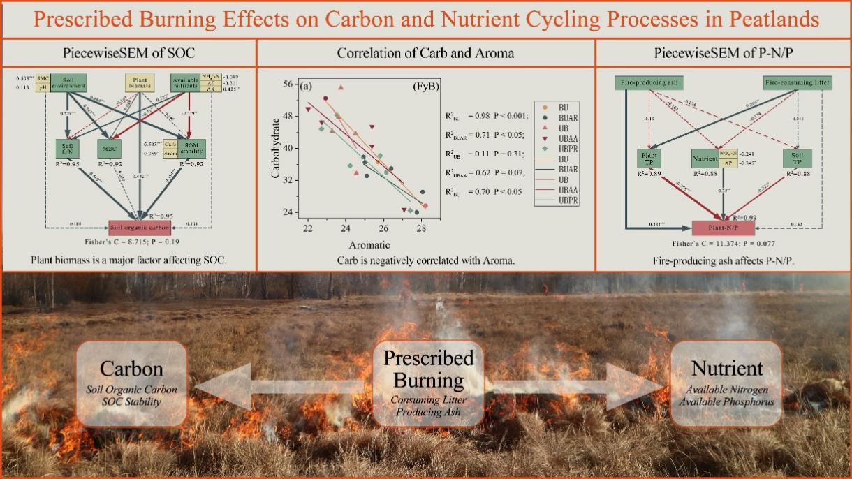 中國(guó)科學(xué)院東北地理所濕地演化與生態(tài)功能學(xué)科組與東北林業(yè)大學(xué)、吉林農(nóng)業(yè)大學(xué)等高校合作,自2020年起在大興安嶺地區(qū)的林緣泥炭地進(jìn)行長(zhǎng)期計(jì)劃火燒模擬試驗(yàn)(圖 1),探究計(jì)劃火燒影響下多年凍土區(qū)泥炭地土壤碳穩(wěn)定性以及養(yǎng)分循環(huán)影響。研究發(fā)現(xiàn),隨著計(jì)劃火燒次數(shù)的增加,泥炭土壤總碳含量逐漸下降,原因在于連續(xù)火燒導(dǎo)致游離顆粒有機(jī)物(fPOM)降低。土壤有機(jī)碳的結(jié)構(gòu)方程模型表明,計(jì)劃火燒后植物生物量的增加直接影響了泥炭地的碳累積,而土壤含水率和pH通過影響土壤碳氮比和土壤有機(jī)碳穩(wěn)定性間接影響了碳累積(圖2)。此外,計(jì)劃火燒導(dǎo)致泥炭地生態(tài)系統(tǒng)從氮限制向磷限制轉(zhuǎn)化,植物氮磷比的結(jié)構(gòu)方程模型表明,火后產(chǎn)生的熱解碳是驅(qū)動(dòng)氮限制向磷限制轉(zhuǎn)化的主要原因。