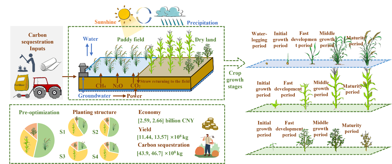 農業灌溉占用全球取用水總量的70%以上。在國家“四水四定”的戰略背景下,解決水土資源時空不匹配的問題對保障我國糧食安全至關重要。水土資源之間聯系錯綜復雜,任何一種資源的短缺都會限制另一種資源的利用,從而降低水土資源的綜合利用效率。在開展農業水土資源優化配置研究時,如何協調二者之間關系是亟需解決的關鍵科學問題。然而,由于極端氣候頻率不斷增加和下墊面條件復雜性加劇,水資源年際間和年內變異系數顯著增強,充分滿足農作物生長過程的水資源可持續供給面臨著巨大的挑戰。特別是在干旱時期,降水量的減少使得可供作物生長的有效降水量大幅下降,從而加劇了農業生產用水的壓力。同時,農業生產過程中過量施用化肥、農藥和農業機械會導致大量碳排放,對生態系統的穩定構成威脅。因此,從水-碳-糧食耦合視角開展基于作物需水過程的農業水土資源優化配置研究對保障我國糧食安全具有重要意義。