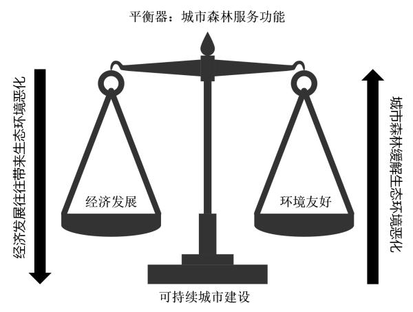 圖1 可持續的城市建設中城市森林服務功能“平衡器”的示意圖