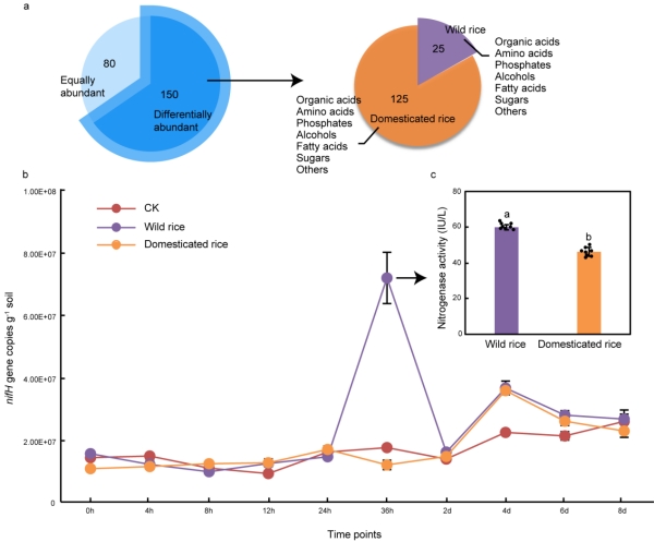 栽培稻的根際微生物組中與氧化亞氮(N?O)生成相關(guān)基因數(shù)量顯著增加。通過田間測(cè)量N?O排放量發(fā)現(xiàn),栽培稻土壤中的N?O排放量顯著高于野生稻。為解析水稻馴化對(duì)根際氮循環(huán)微生物組的調(diào)控機(jī)制,研究人員系統(tǒng)比較野生稻和栽培稻根系代謝組,發(fā)現(xiàn)野生稻根系分泌物與微生物固氮基因豐度呈正相關(guān)。進(jìn)一步實(shí)驗(yàn)表明,向黑土中添加野生稻根系代謝物,可以顯著增加土壤微生物固氮基因豐度和固氮酶活性。