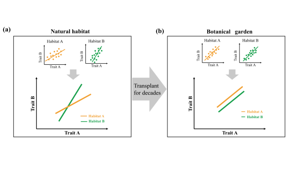 圖1 來自不同生境的木本植物在自然環境中呈現相異的功能性狀權衡關系,該關系在移栽入植物園數十年后逐漸呈現為趨同性(? 2025 Wiley Ltd.)