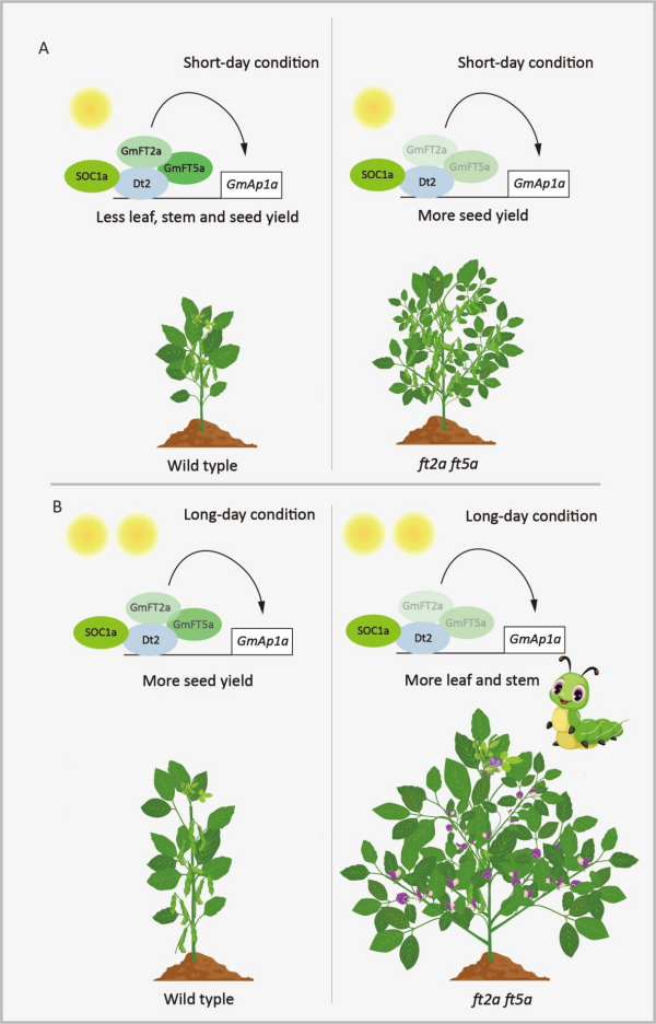 本研究通過編輯大豆中的開花素基因GmFT2a和GmFT5a,成功創(chuàng)制出兼具高產(chǎn)籽粒和高生物量的種質(zhì)。在短日照條件下,雙突變體表現(xiàn)出顯著的籽粒產(chǎn)量提升,主莖節(jié)數(shù)、分枝數(shù)和單株莢數(shù)顯著增加。在長日照條件下,雙突變體的總生物量顯著提高,表現(xiàn)為營養(yǎng)生長期延長、葉片增大、分枝和節(jié)數(shù)增加。雙突變體的可溶性蛋白和可溶性糖含量保持不變,而苯丙氨酸含量增加、單寧含量降低,可作為優(yōu)質(zhì)莖葉飼料。研究進(jìn)一步揭示了GmFT2a和GmFT5a調(diào)控大豆株型的分子機(jī)制。GmFT2a和GmFT5a蛋白不僅相互結(jié)合,還與大豆分枝和結(jié)莢習(xí)性關(guān)鍵基因Dt2和SOC1a相互作用,形成復(fù)合物,強(qiáng)烈激活下游基因GmAp1s的表達(dá),從而影響大豆的株型發(fā)育。該研究為培育適應(yīng)不同生產(chǎn)需求的大豆品種提供了理論依據(jù)和技術(shù)支撐,有助于提高大豆的市場競爭力和經(jīng)濟(jì)價(jià)值。