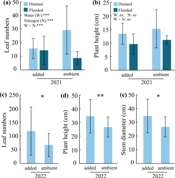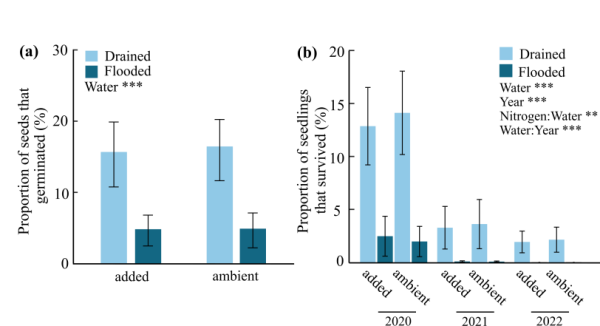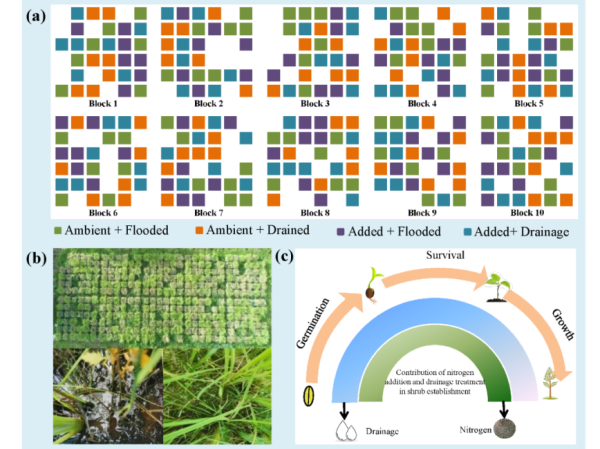 本研究表明了干旱化為灌木在淡水沼澤中的建殖提供了重要的基礎條件。當幼苗成熟后,氮富集可以通過促進灌木的生長進而促進其擴張。我們的研究通過探討干旱化和氮富集對本木植物不同建殖階段的影響,為探究全球變化背景下草本濕地中的灌木擴張機制提供了新視角。