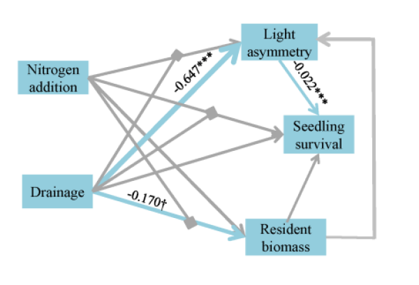 結果發(fā)現第一年干旱化會顯著增加灌木植物的種子萌發(fā)和幼苗存活,且對幼苗存活的促進作用一直持續(xù)到后兩年(圖 2)。結構方程模型顯示干旱化通過間接降低灌木和草本植物對地上光資源的不對稱性競爭進而促進了灌木幼苗的存活(圖 3)。此外,三年持續(xù)的淹水處理導致了灌木幼苗全部死亡,但是經過三年的干旱處理后,氮添加顯著地增加了灌木植株的葉片數、株高和莖粗(圖 4)。