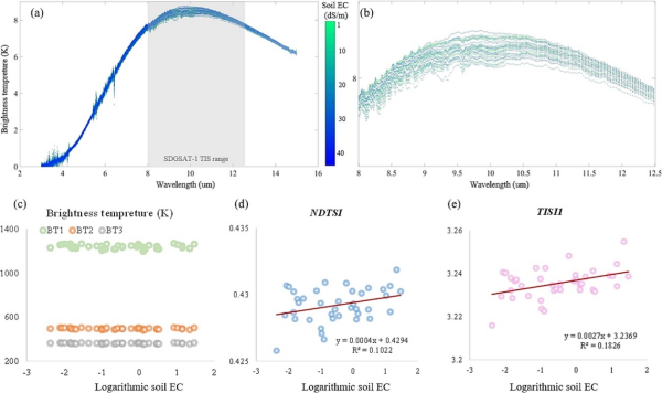 圖1. 熱紅外波段對(duì)不同鹽度水平土壤樣本(n =39)的光譜響應(yīng)敏感性:(a) 3-15μm范圍內(nèi)土壤樣本的地面測量亮度溫度;(b) 8-12.5μm范圍內(nèi)(SDGSAT-1 TIS的光譜覆蓋范圍)土壤樣本的地面測量亮度溫度;(c) 衛(wèi)星等效亮度溫度與土壤導(dǎo)電率(LnEC)之間的關(guān)系;(d)NDTIS與土壤導(dǎo)電率(LnEC)之間的關(guān)系;(e)TISI1與土壤導(dǎo)電率(LnEC)之間的關(guān)系