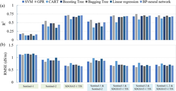 圖2. 基于多種機(jī)器學(xué)習(xí)算法在七種輸入變量組合場景下的土壤鹽分反演模型精度比較:(a)決定系數(shù);(b)均方根誤差