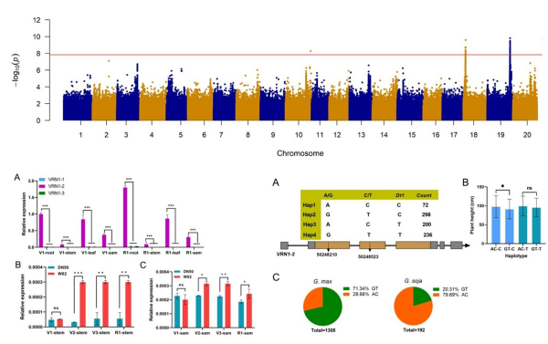 圖1. 大豆株高全基因組關(guān)聯(lián)分析以及候選基因VRN1-2的表達和單倍型分析