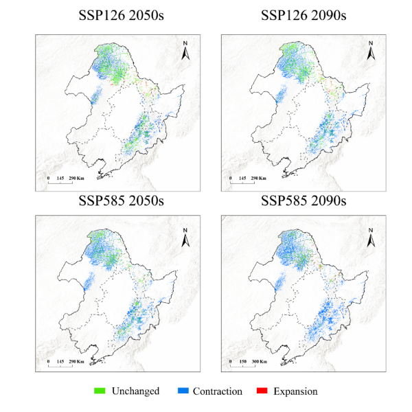 中國科學(xué)院東北地理與農(nóng)業(yè)生態(tài)研究所濕地生物與環(huán)境學(xué)科組研究人員基于野外調(diào)查以及文獻搜集獲取了點位尺度的泥炭地分布數(shù)據(jù),通過多種算法結(jié)合以及最優(yōu)模型篩選的方式構(gòu)建了東北地區(qū)的泥炭地分布模型。并基于當(dāng)前氣候條件以及未來兩種氣候情景(SSP126,SSP585)下21世紀(jì)中(2040-2060年)和21世紀(jì)末(2080-2100年)的泥炭地潛在分布及變化動態(tài)。