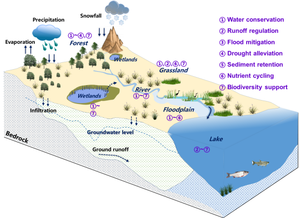 在全球氣候變化與人類活動的影響下,濕地作為地球生態(tài)系統(tǒng)的關鍵節(jié)點,其水文多功能性在全球生態(tài)與水資源管理領域備受矚目(圖1)。濕地不僅是生物多樣性的庇護所,更是水循環(huán)的重要調節(jié)器,具備調節(jié)徑流、緩解洪水、維持低流量、促進地下水補給以及支持生物多樣性等多種水文功能。然而,當前研究多聚焦于濕地的單一水文功能,對于濕地綜合水文功能的協(xié)同作用與整體貢獻尚缺乏系統(tǒng)性認識,這限制了濕地在流域水資源管理與生態(tài)保護中潛力的充分挖掘。如何從流域尺度量化濕地的水文多功能性,成為國際生態(tài)水文學領域的前沿科學問題