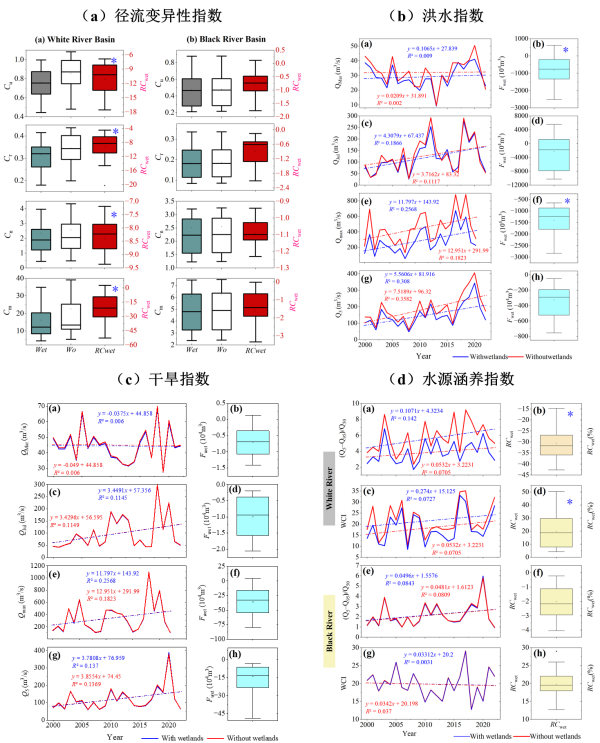 近日,東北地理研究所水文與水資源學科組科研人員聯(lián)合西南林業(yè)大學和加拿大國立科學研究院提出了流域濕地水文多功能性定量評估框架,利用耦合濕地模塊(包括河濱濕地和孤立濕地模塊)和寒區(qū)水文過程(凍土凍融、積雪融化)的半分布式水文模型平臺(PHYSITEL/HYDROTEL),動態(tài)模擬流域水文過程,引入徑流變異性、洪水強度、干旱強度和水資源涵養(yǎng)能力等水文指標構建了濕地水文多功能性定量評估體系,并以青藏高原黃河源區(qū)的黑河與白河流域為研究區(qū),量化評估了流域濕地水文多功能性。結果顯示,濕地通過減少不均勻分布系數(shù)、完全調整系數(shù)、集中度和變化幅度來降低徑流變異性。濕地可以有效緩解洪水風險,降低峰值流量,同時提高枯季低流量和基流量。此外,濕地還增強了流域的水資源儲存與涵養(yǎng)能力,對黑河和白河流域蓄水能力的提升作用分別達到30.6%和19.8%。濕地水文多功能性顯著提升了黑河和白河流域應對水文極端事件的韌性(圖2)。
