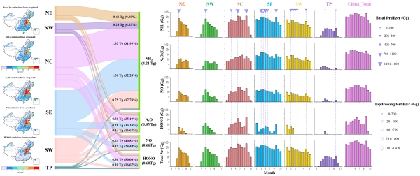 氮肥施用是保障糧食安全的關鍵措施之一,對提高農作物產量、增強土壤肥力、促進農業可持續發展具有不可替代的作用。然而,過量或不合理的氮肥施用不僅降低肥料利用率,還會導致溫室氣體排放增加和大氣污染等一系列氣候或環境問題。中國作為全球最大的化肥消耗國,過量施肥導致的農田活性氮(Nr,包括NH3、N2O、NO和HONO)排放對區域大氣環境的影響不容忽視。在當前其他人為污染源得到有效控制并逐步減少的背景下,明確農田Nr排放的時空分布特征及其對區域細顆粒物(PM2.5)和臭氧(O3)污染的貢獻將有助于“持續深入打好藍天、碧水、凈土保衛戰”。然而,現有研究多基于統計方法估算農田Nr的年排放量,缺乏高時空分辨率的排放數據,制約了農田Nr在PM2.5與O3污染形成過程中作用的模擬準確性。中國科學院東北地理與農業生態研究所區域大氣環境學科組研究人員將國際上先進的基于過程的農業生態模型FEST-C*進行本地化改進,成功構建了WRF-FEST-C*-CMAQ多模型系統。應用該系統對2020年中國農田Nr排放進行逐日模擬,深入分析了其時空分布特征及主要驅動因素,全面評估了農田Nr排放對區域大氣PM2.5和O3生成的影響。