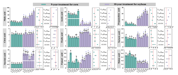 東北地理所農田分子生態學科組科研人員基于長期田間定位試驗,系統解析了玉米-大豆輪作與連作模式下,不同施肥及有機物料管理措施對作物生育期間土壤低分子量有機酸種類、數量及其與土壤酸化指標間的關系;在連作、輪作、施肥措施和作物秸稈還田條件下通過作物移除的陰離子和陽離子來計算凈H?、總H?和OH?的生成,并探討長期管理對作物離子移除差異的響應,從而揭示凈H?生成與土壤酸化之間的關系。研究結果表明,種植玉米土壤中,低分子量有機酸(LMWOAs)主要為蘋果酸、乙酸和丙二酸,而種植大豆土壤中,低分子量有機酸主要為蘋果酸、丙二酸和琥珀酸。連作顯著改變了玉米拔節期和大豆開花期土壤LMWOAs含量(圖1)。此外,作物生長旺盛期土壤LMWOAs和鹽基離子總量對黑土農田土壤酸化過程的影響與作物種類及田間管理措施密切相關。玉米和大豆移除產生的凈H?可能分別導致土壤pH每年下降0.053-0.074和0.032-0.045個單位。研究認為,土壤pH的變化并不完全與作物鹽基離子移除相關,糞肥施用與輪作結合是緩解土壤酸化的有效方法,糞肥緩解土壤酸化的效果優于秸稈還田。大氣酸沉降、施肥與管理方式、作物種植類型以及作物秸稈離田的鹽基離子移除作用是黑土酸化主要原因(圖2)。上述研究揭示了黑土酸化的本質與關鍵過程,為東北旱田黑土土壤酸化機理提供了重要的理論支撐,也為研發有效的防治酸化措施奠定了科學基礎,對保障糧食穩產高產、維護國家糧食安全具有重要戰略意義。