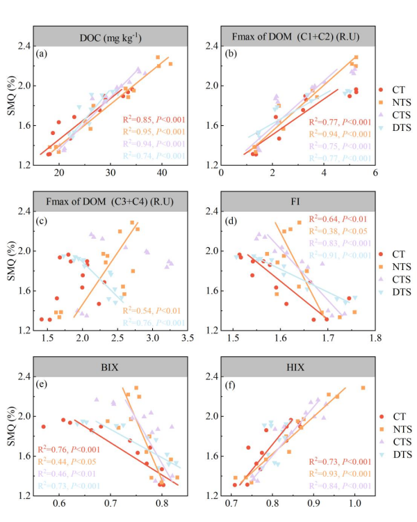 研究發現,SMQ呈現隨土層深度增加而遞減的垂直分布規律。與對照秸稈不還田相比,秸稈還田處理顯著提高了0-40 cm土層的SMQ(圖1),其中秸稈覆混還田處理的提升效果最為顯著(11.60%)。此外,秸稈還田顯著增加了DOM的最大熒光強度,并提高其類腐殖質組分的含量(圖2)。二維相關光譜分析進一步揭示,在秸稈覆蓋和覆混還田處理下,類蛋白質樣熒光組分具有優先變化級,而在秸稈深翻還田處理下,類腐殖質樣熒光組分的變化則更優先。線性回歸分析表明,SMQ與溶解有機碳(DOC)和DOM中類腐殖質組分的含量均呈顯著正相關(圖3)。隨機森林分析表明,在0-20 cm土層,土壤胞外酶活性和養分是調控SMQ的主要因子;而在20-40 cm土層中,DOM特性(DOC和類腐殖質組分)是驅動SMQ變化的主導因素。研究結果闡明了秸稈還田下DOM介導的SMQ垂直變化機制,為黑土區土壤質量提升提供了新的科學依據。