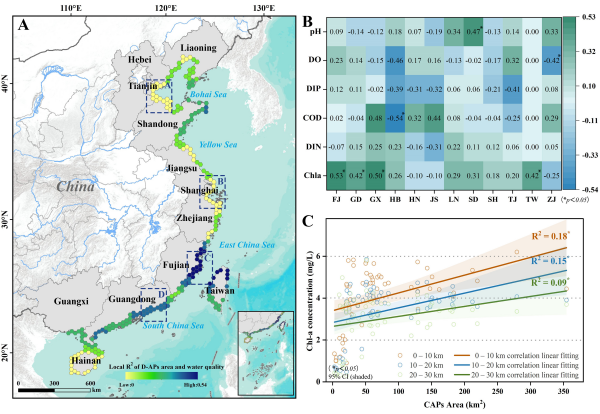 濱海養殖池是海岸帶生態系統和全球糧食生產體系的重要組成部分,對于保障全球糧食安全及沿海地區社會經濟發展至關重要。然而,濱海養殖池的快速擴張及其季節性排水引發了近海海域水質嚴重惡化,對海岸帶可持續發展構成嚴重威脅。已有研究缺乏對中國國家尺度濱海養殖池排蓄水周期的動態監測及其對近海水質影響的系統性解析,限制了我國海岸帶生態保育與區域可持續發展。