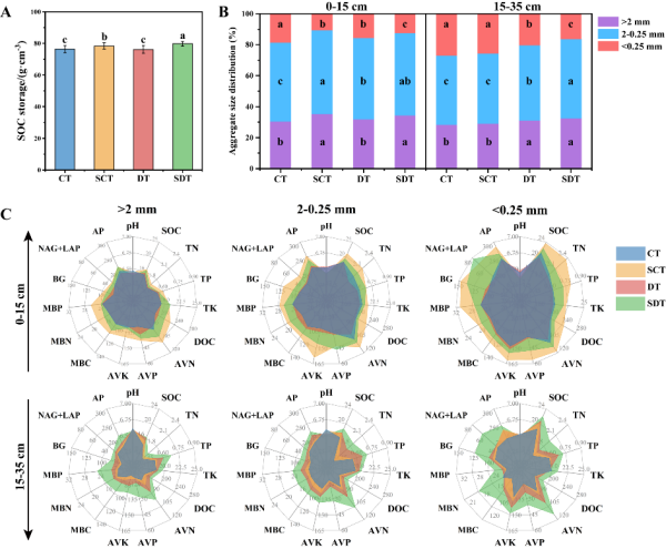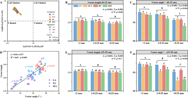 近期,中國科學(xué)院東北地理與農(nóng)業(yè)生態(tài)研究所黑土保護與利用學(xué)科組,依托秸稈還田定位試驗,分析了不同粒徑團聚體(>2 mm、2–0.25 mm、<0.25 mm)的有機碳和養(yǎng)分含量、微生物群落結(jié)構(gòu)及其資源限制特征,揭示了秸稈還田通過團聚體中微生物資源限制影響有機碳儲存的機制。研究結(jié)果顯示,秸稈深翻還田(SDT)在0-35 cm土層中的土壤有機碳儲量顯著高于其他處理,較常規(guī)耕作(CT)、秸稈淺翻還田(SCT)和深翻(DT)分別提高了4.45%、1.71%和4.64%(圖1)。秸稈還田(SDT和SCT)顯著增加了>2 mm團聚體比例,提高了其養(yǎng)分含量和微生物生物量。酶化學(xué)計量分析進一步表明,秸稈還田能有效緩解了微生物的碳和磷限制,該效應(yīng)在深翻條件下尤為顯著(圖2)。
