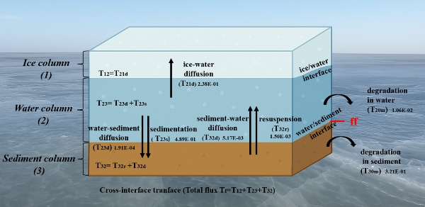圖2.PAHs在冰層、水層、沉積物層的質(zhì)量平衡圖
