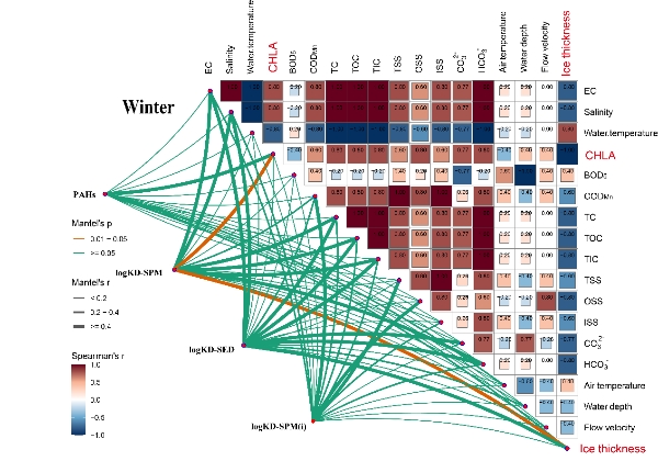 在此基礎(chǔ)上,本研究運用Ⅳ逸度模型和Spearman相關(guān)性分析來對湖泊中PAHs的環(huán)境行為過程進(jìn)行刻畫,并明確其主要驅(qū)動機制。逸度模型分析表明,低環(huán)PAHs易從沉積物向上遷移至水層,而高環(huán)PAHs則表現(xiàn)出相反的趨勢。Spearman相關(guān)性分析表明,冰封期PAHs的分布受其自身理化性質(zhì)、研究區(qū)自然條件以及人為活動等因素協(xié)同影響。本研究解釋了寒區(qū)湖泊PAHs的特異性環(huán)境行為特征及規(guī)律,為寒區(qū)湖泊污染物綜合管控提供理論基礎(chǔ)。