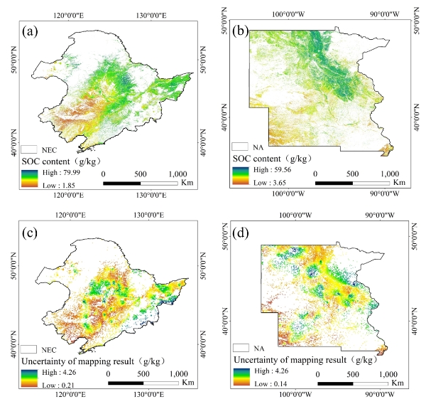 圖1. 中國東北與北美黑土區SOC制圖結果