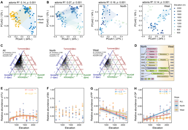 土壤線蟲在山地生態系統中發揮著重要生態功能,但其在不同海拔梯度上的分布格局及群落組裝機制仍存在諸多未解之處。針對這一科學難題,土壤物質循環學科組等研究團隊以長白山北坡和西坡為研究區域,共采集108份土壤樣品,覆蓋九個海拔高度(600-2200 m)。系統分析了線蟲總體群落及不同營養類型群落的空間相似性與組裝過程,并量化評估了海拔、環境距離和地理距離對群落空間變異及組裝機制的相對貢獻。
