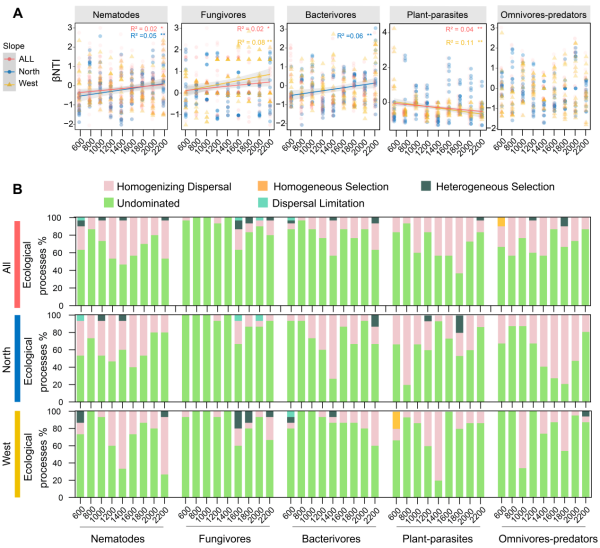 結果表明,物種更替是長白山海拔梯度上線蟲群落組成變化的主要驅動因素。群落結構沿海拔梯度呈顯著分異:低海拔區(600-1000 m)以植物寄生線蟲為主導,中海拔區(1200-1600 m)以食真菌線蟲為主導,高海拔區(1800-2200 m)則以雜食性—捕食性線蟲占優勢??傮w來看,隨機過程在山體、北坡與西坡上線蟲群落及營養群體的組裝中占主導地位,主要表現為擴散限制和選擇作用較弱的情形。地理距離是影響線蟲群落組成與組裝機制的關鍵因素,但其與海拔及環境因子的相對貢獻在不同營養群體間存在差異。