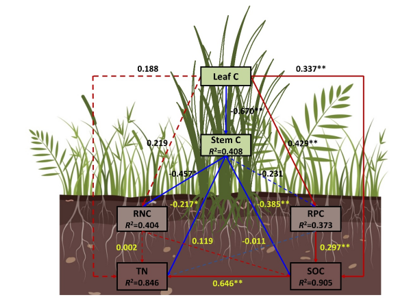 研究結(jié)果表明,葉片碳與根系磷的協(xié)同作用共同決定了土壤有機碳和全氮含量;同時,葉片碳與莖碳含量之間的權(quán)衡關(guān)系也影響了有機碳和全氮的積累,說明地上與地下性狀的相互作用在半干旱區(qū)濕地土壤碳氮累積中具有重要調(diào)控作用。此外,相比于地上性狀,根系性狀組合及其關(guān)聯(lián)關(guān)系也可作為評估退化濕地植物多樣性與生物量的可靠預測指標。在灌木入侵濕地中,土壤含水量的降低促進了植物多樣性的增加,但導致典型濕地物種減少,這一過程通過葉面積與葉片干物質(zhì)量之間的權(quán)衡關(guān)系實現(xiàn),并受到土壤pH的顯著間接調(diào)控。