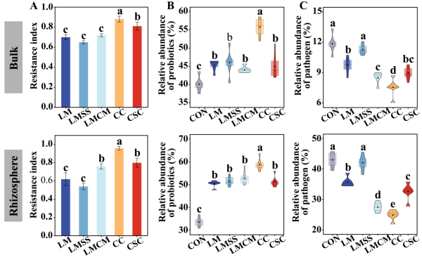 圖1不同改良劑施用下土壤微生物群落抗性及潛在有益菌和植物病原菌的相對豐度