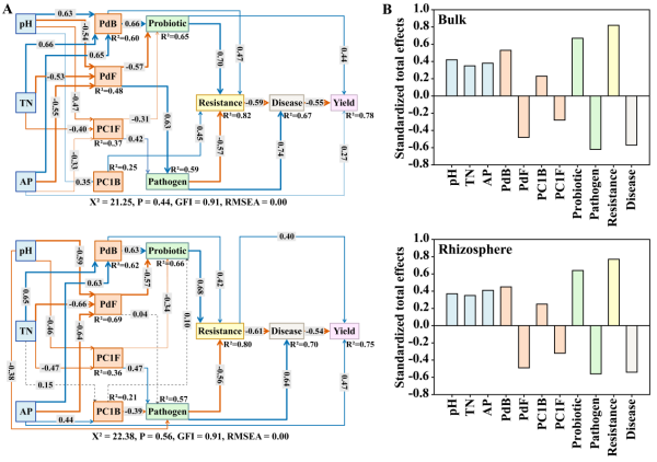 圖3改良劑介導的土壤性質和微生物群落特征與抑病能力及大豆產量的互作關系
