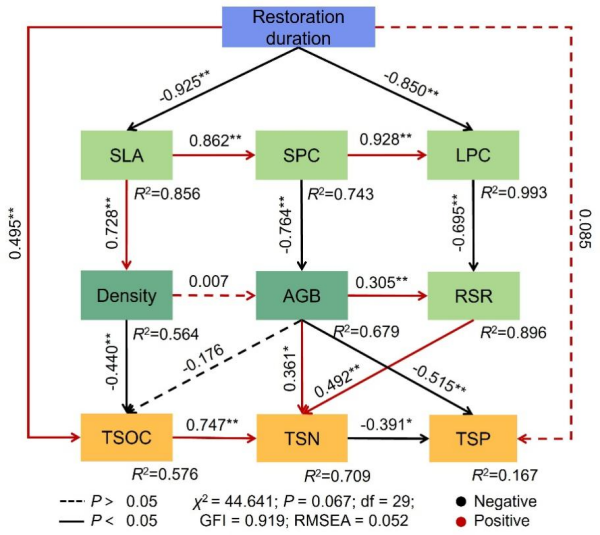 研究團(tuán)隊(duì)分析了農(nóng)業(yè)退耕后自然恢復(fù)的淡水沼澤濕地的土壤功能、植物群落特征和功能性狀。結(jié)果表明,土壤有機(jī)碳儲(chǔ)量和氮儲(chǔ)量分別在恢復(fù)14和17年達(dá)到峰值后趨于穩(wěn)定,而磷儲(chǔ)量則先下降后上升。方差分解分析表明,土壤功能動(dòng)態(tài)主要由植物群落特征與功能性狀的相互作用驅(qū)動(dòng)。隨機(jī)森林模型確定了關(guān)鍵驅(qū)動(dòng)因素,而結(jié)構(gòu)方程模型確定了恢復(fù)時(shí)間對(duì)土壤功能的直接影響和植物變量介導(dǎo)的間接途徑。具體而言,比葉面積與植物密度協(xié)同下降,促進(jìn)了土壤有機(jī)碳積累;比葉面積與莖磷含量協(xié)同降低,提升了地上生物量和土壤總氮,但減少了土壤磷的累積。此外,基于性狀交互作用的生態(tài)功能恢復(fù)理論框架,在自然恢復(fù)草甸中也得到了驗(yàn)證,并強(qiáng)調(diào)了恢復(fù)目標(biāo)群落比單一目標(biāo)物種更能提升生態(tài)功能,突破了傳統(tǒng)以目標(biāo)物種為中心的恢復(fù)策略。