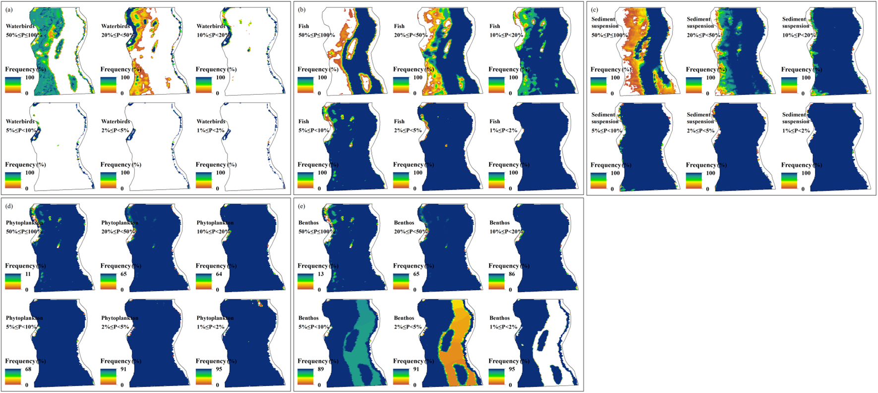 圖2 洪泛濕地潛在生境的空間分布 (a) 水鳥;(b) 魚類;(c) 泥沙懸浮物;(d) 浮游植物;(e) 底棲動物(頻率是指某一區域適宜特定物種生存的天數占該特定洪水頻率發生總天數的比例)