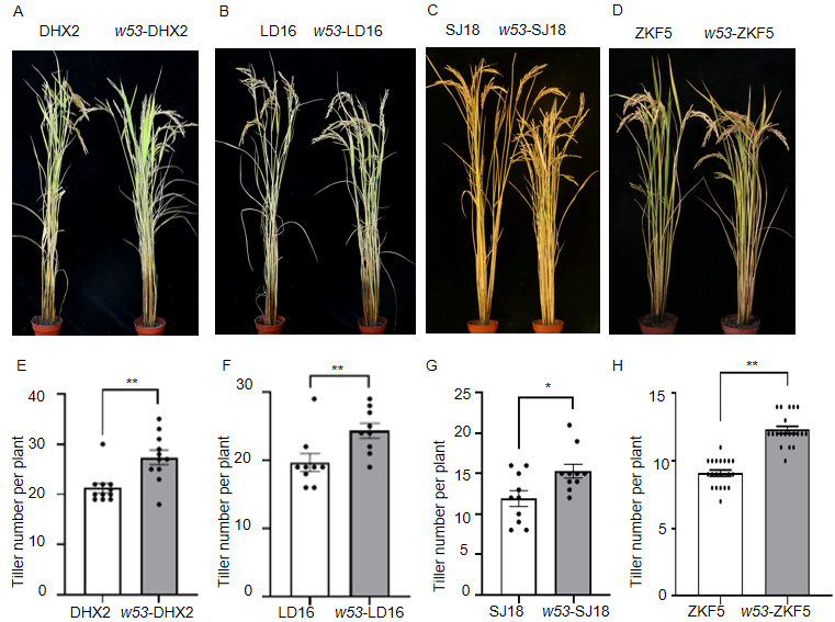 圖1. 不同背景下oswrky53材料分蘗數均顯著增加