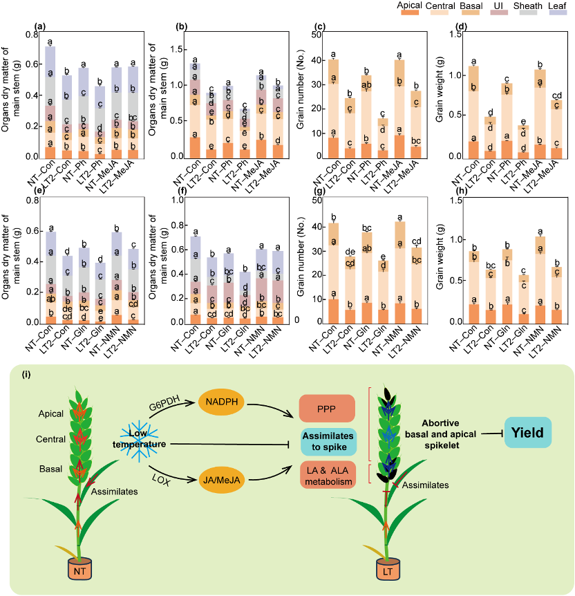 該研究于小麥藥隔期開展低溫處理試驗,結果表明,低溫處理導致小麥主莖產量顯著下降,其中穗基部和頂部小穗的敗育率顯著升高。通過整合常規(guī)代謝組學、空間代謝組學及轉錄組學分析,闡明了小麥葉片、穗下節(jié)間以及穗部不同區(qū)域對低溫脅迫的代謝和轉錄差異響應,證實低溫脅迫下,小麥通過激活亞油酸/α-亞麻酸代謝啟動茉莉酸介導的防御反應,并通過磷酸戊糖途徑維持碳代謝平衡和能量供應。這兩條途徑的協(xié)同作用,決定了碳水化合物能否從源葉高效轉運至穗部,并在小穗間進行合理分配,進而有效緩解低溫導致的產量損失。該研究為解析作物逆境適應與產量形成的平衡調控機制提供了全新視角,也為小麥田間抗逆栽培技術的指定與優(yōu)化提供了重要理論依據。