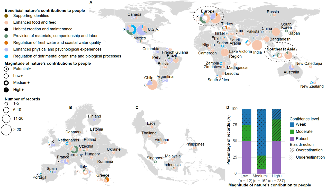 該研究基于“自然對人類貢獻(Nature’s Contributions to People)”框架開發了一套半定量評估方法,系統性評估了全球外來淡水大型動物對人類社會產生的正面與負面影響。研究結果表明,已有 93種外來淡水大型動物(占現存物種的43%)被引入到其本土分布區之外,涵蓋了魚類、哺乳類、爬行類和兩棲類。該研究共識別了429項正面社會經濟效應記錄(圖1),包括提升食物供給(57%)、促進休閑漁業和生態旅游(20%)以及提供生產和貿易所需的原材料供給(12%)等。一些淡水大型動物如鯉魚(Cyprinus carpio)、草魚(Ctenopharyngodon idella)和尖齒胡鯰?(Clarias gariepinus)等在全球多地被引入后已成為當地居民重要的食物來源和漁業資源,而尼羅鱷(Crocodylus niloticus)和暹羅鱷等(Crocodylus siamensis)則常被引入到本土分布區之外用于發展養殖業和寵物貿易。研究還發現,亞洲和非洲引入外來淡水大型動物的主要動機是增強食物供給,而在北美則主要與休閑漁業和寵物貿易相關。