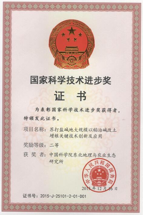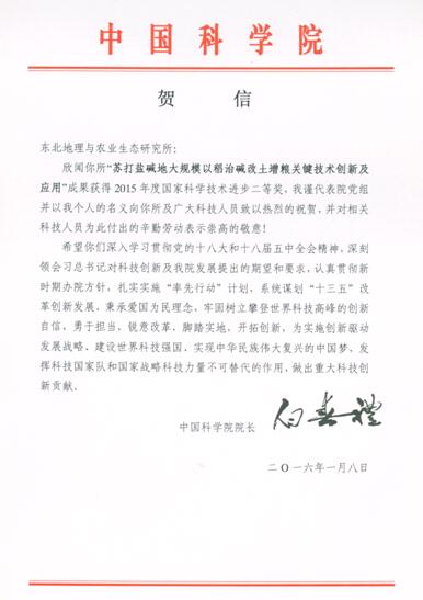 其中,由中國科學院東北地理與農(nóng)業(yè)生態(tài)研究所為第一完成單位,吉林省農(nóng)業(yè)科學院、吉林農(nóng)業(yè)大學、吉林省白城市農(nóng)業(yè)科學院以及通化市農(nóng)業(yè)科學研究院等5家單位共同參與完成的“蘇打鹽堿地大規(guī)模以稻治堿改土增糧關鍵技術創(chuàng)新及應用”重大成果獲2015年度國家科技進步獎二等獎。項目第一完成人梁正偉研究員代表獲獎項目組出席了獎勵大會,受到了習近平主席、李克強總理等黨和國家領導人的親切接見并合影留念。1月8日中國科學院院長白春禮院士也向我所發(fā)來了賀電。