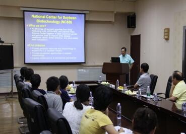 訪問期間Henry T. Nguyen教授介紹了美國密蘇里大豆生物技術中心的研究領域及成果。他的團隊主要從事大豆高產、抗包囊線蟲及抗病性、非生物脅迫和大豆品質方面的分子遺傳特性研究,目的是為美國大豆產業的發展提供良好基因資源。目前Henry T. Nguyen教授的團隊利用分子遺傳技術,育成了可代替橄欖油的高油酸大豆品種,已在生產上應用,預計在未來幾年有望大面積推廣。會議期間Henry T. Nguyen教授對參會師生提出的具體問題進行了詳細的分析與解答。交流會后,倆位專家參觀了我所的實驗室和試驗基地。