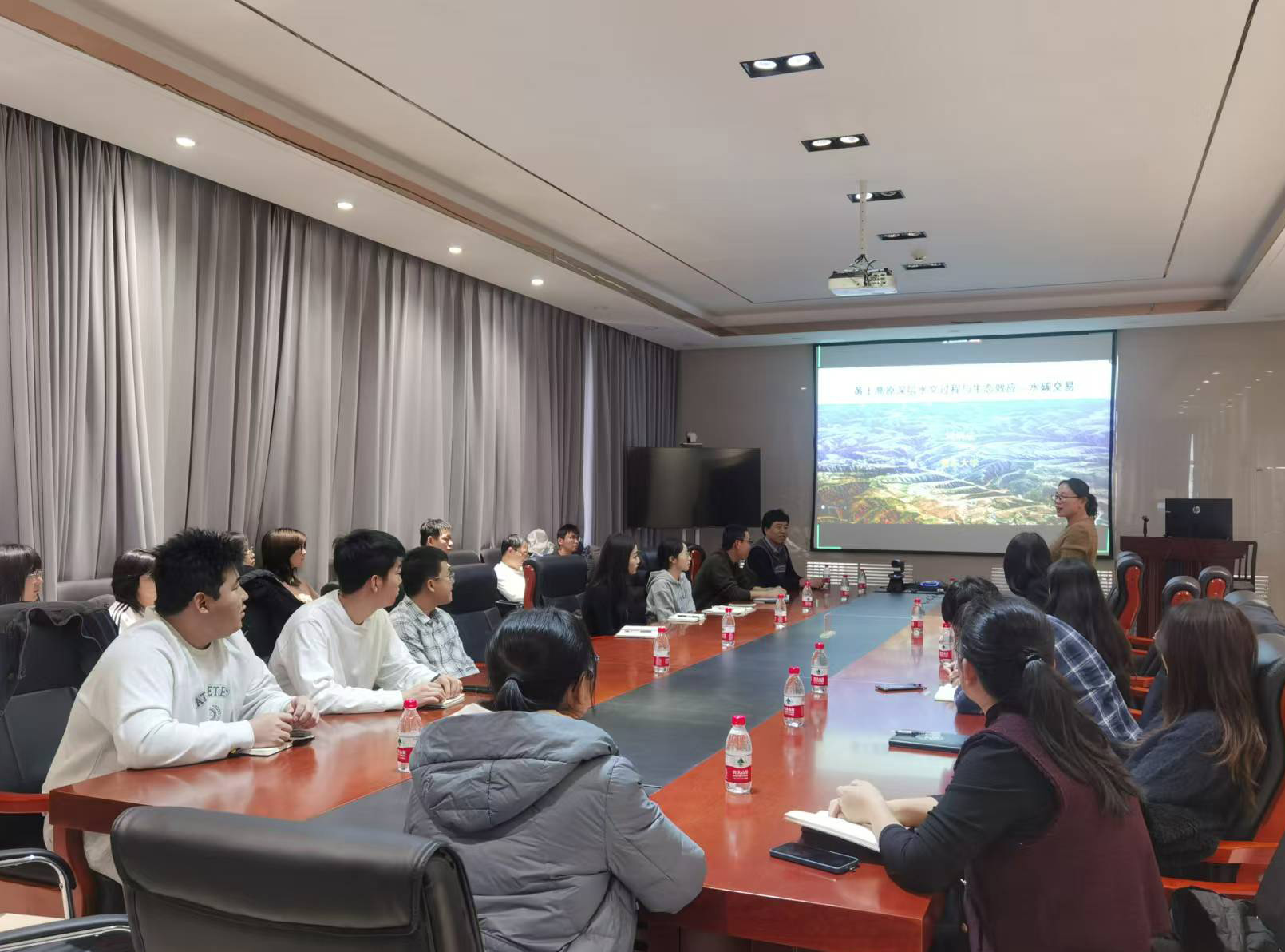 司炳成教授以“相較于淺根植物,深根系植物如何影響地下水補給?如何消耗深層土壤水?能不能增加地下碳儲存?”三個問題開篇,詳細講解了淺根系與深根系植被下地下水補給的控制因子,探討了地下水同位素與補給機制,介紹了深層土壤水與碳的交換過程。司炳成教授還展示了基于林齡與深層土壤水分虧缺之間的邏輯增長關(guān)系模型,用于估算區(qū)域尺度人工林的深層土壤水分虧缺,并介紹了基于深層土壤水分虧缺與深層根系碳儲量之間的Logistic關(guān)系模型,估算了區(qū)域尺度人工林的深層根系碳儲量。司炳成教授的報告深入淺出,極具指導(dǎo)意義,激發(fā)了所在領(lǐng)域科研人員和研究生的思考。與會師生與司炳成教授展開了深入交流,收獲了寶貴的學(xué)術(shù)啟發(fā)。